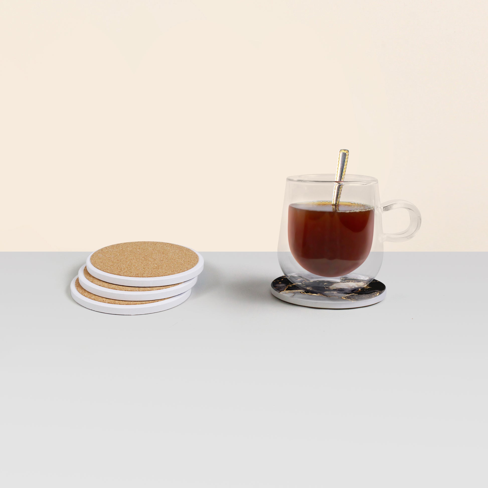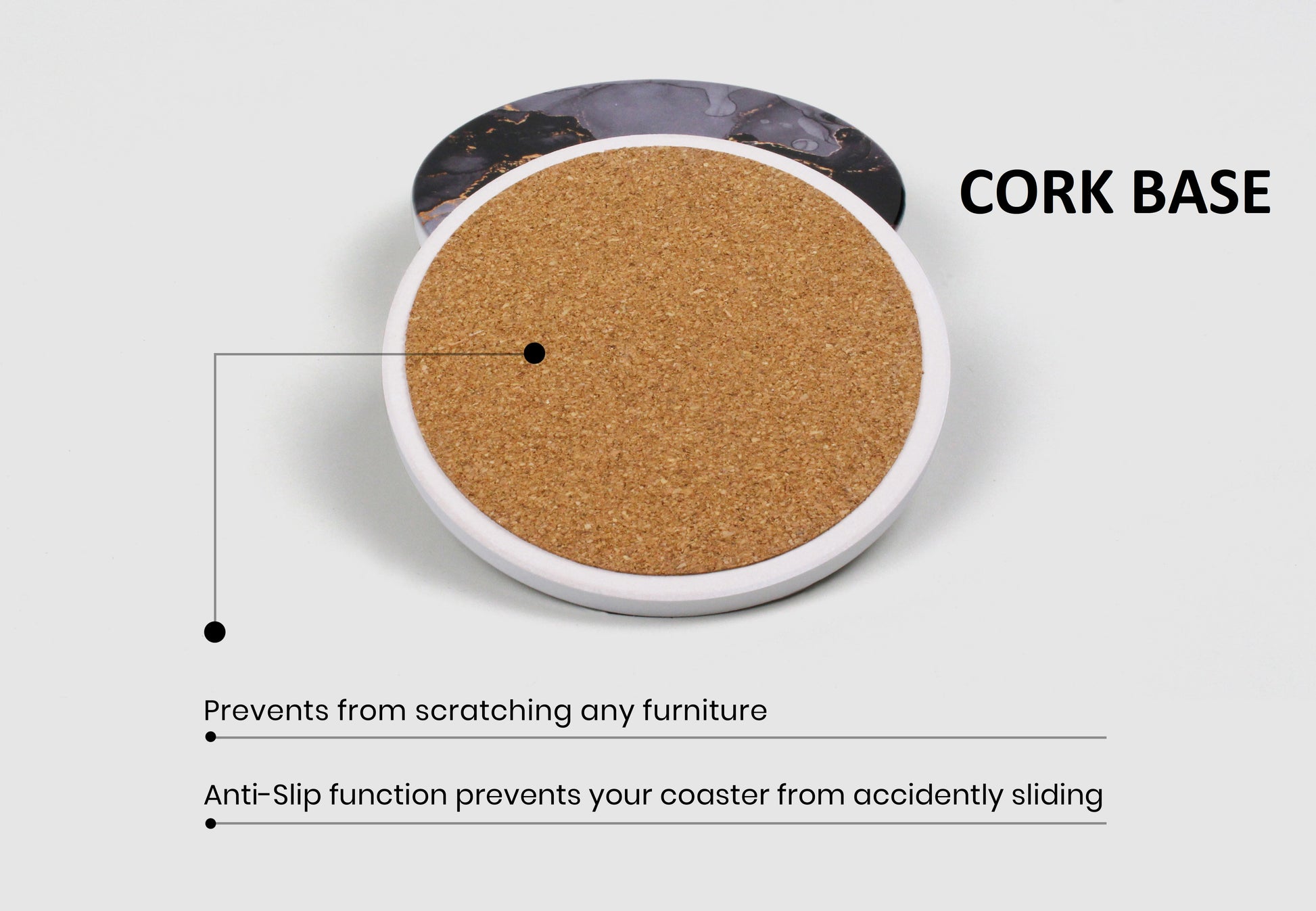 - [ SURFACE FRIENDLY ] - The base of our coasters is made of cork which prevents scratches appearing on your tables. The anti-slip feature also prevents the coasters from sliding.